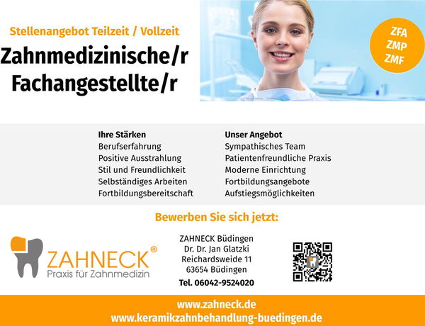 Wir bevorzugen online-Bewerbungen direkt über das Karriereportal. Solltest Du Dich dennoch per E-Mail bewerben wollen, bitte sende Deine Bewerbung an bewerbung@zahneck.de